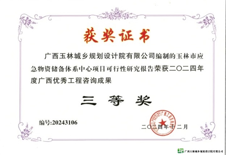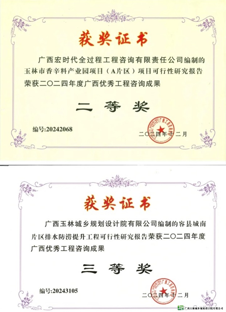 《玉林市香辛料产业园项目(A片区)项目可行性研究报告》,荣获二等奖;《容县城南片区排水防涝提升工程可行性研究报告》与《玉林市应急物资储备体系中心项目可行性研究报告》两项目同获三等奖。